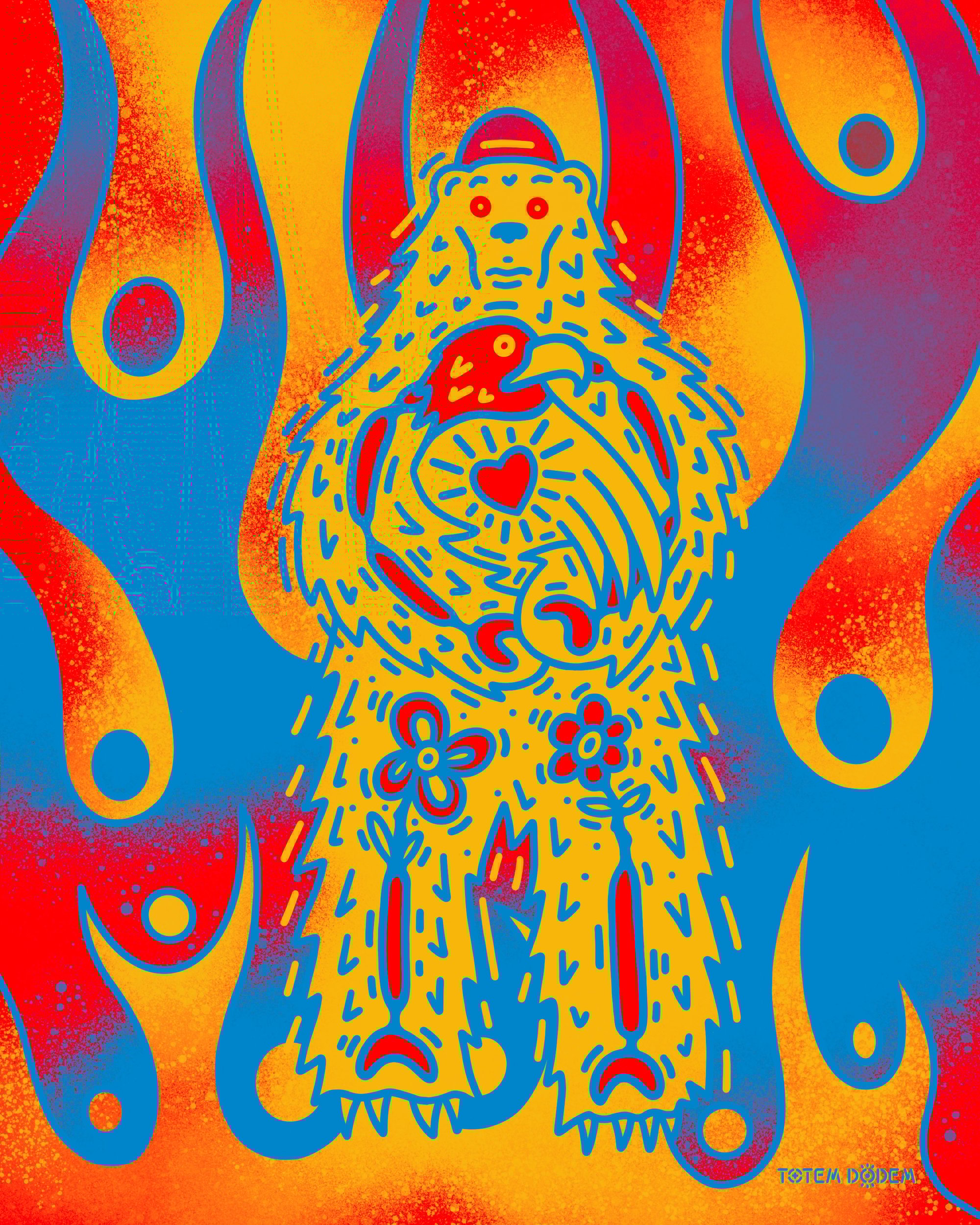 The Bear uses it's courage to protect it's friend the Eagle through the chaos of flames.